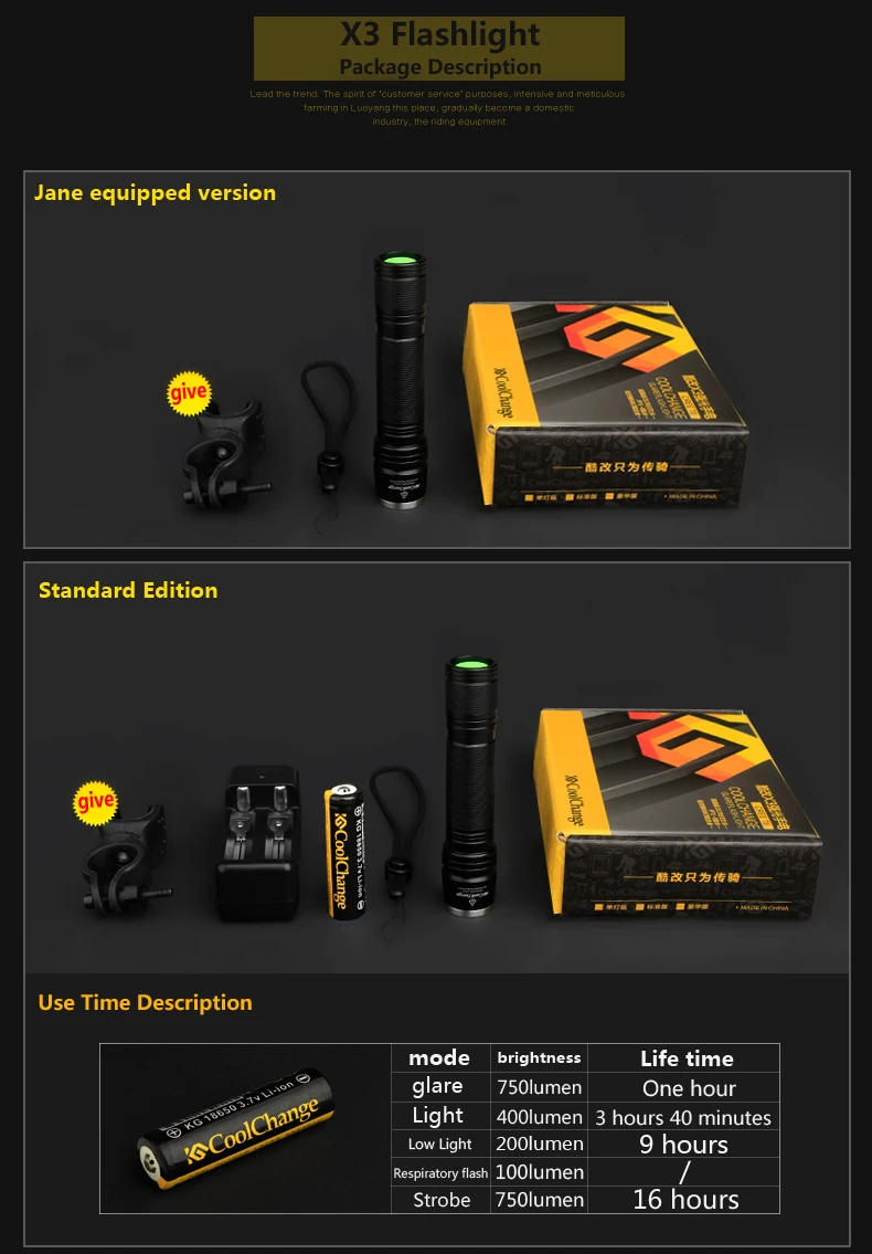 Coolchange Front Bycicle Light Mtb Flashlight for Bicycle Torchlight Bike Led Cycling Light Waterproof 1000 Lumens Bicycle Torch FEATURES: Aircraft-grade aluminum alloy 6063 Oxidation Quality Plating Spotlight IPX6 waterproof CREE T6 lamp Theory 1000lm Lens Edging MCU control chip regulator USE 18650 lithium battery (not included)